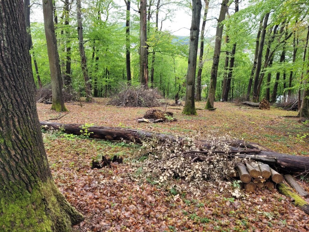 Im vergangenen Winter hat unser Forstbetrieb im Dickenbähnli unter den alten Eichen auf einer Fläche von rund 30 aren das vorhandene Unterholz abgesägt und auf Haufen aufgeschichtet. Dies wurde mit dem Ziel gemacht, dem vorhanden Eichelnaufschlag die Chance zu geben aufzukeimen. Dafür braucht es eben auch Licht. Wie die folgenden Bilder zeigen, wurde dies mit Erfolg gemacht. Eine Garantie, dass diese Eichen nun wirklich aufwachsen, gibt es allerdings nicht. Leider werden Eichen in jungen Jahren oft von Pilzen befallen. Ebenso sind sie darauf angewiesen, dass sie ab einem gewissen Alter genügend Licht haben. Daher werden auch weiterhin Eingriffe auf der Fläche nötig sein.
