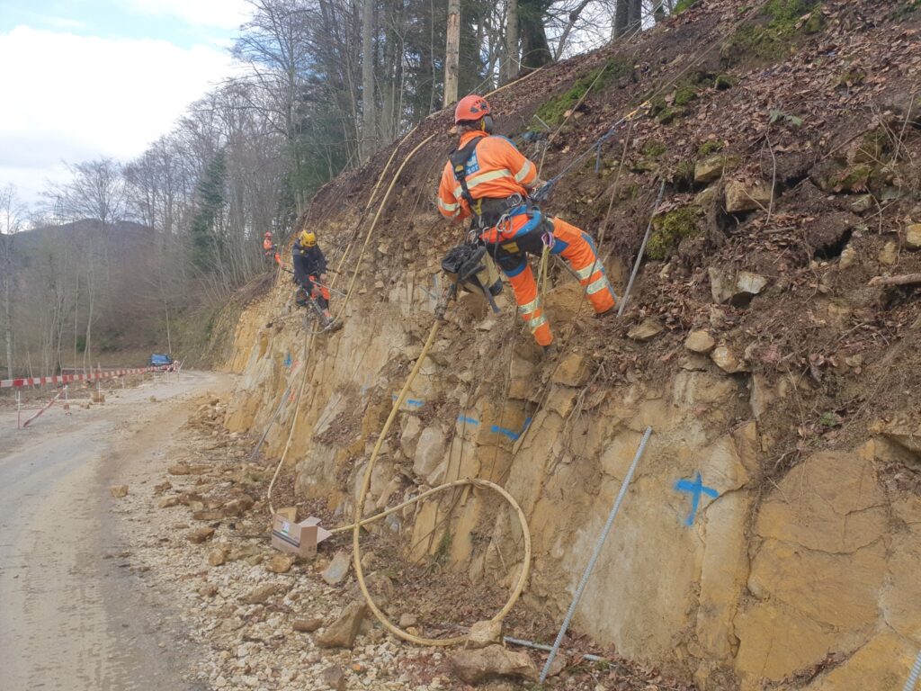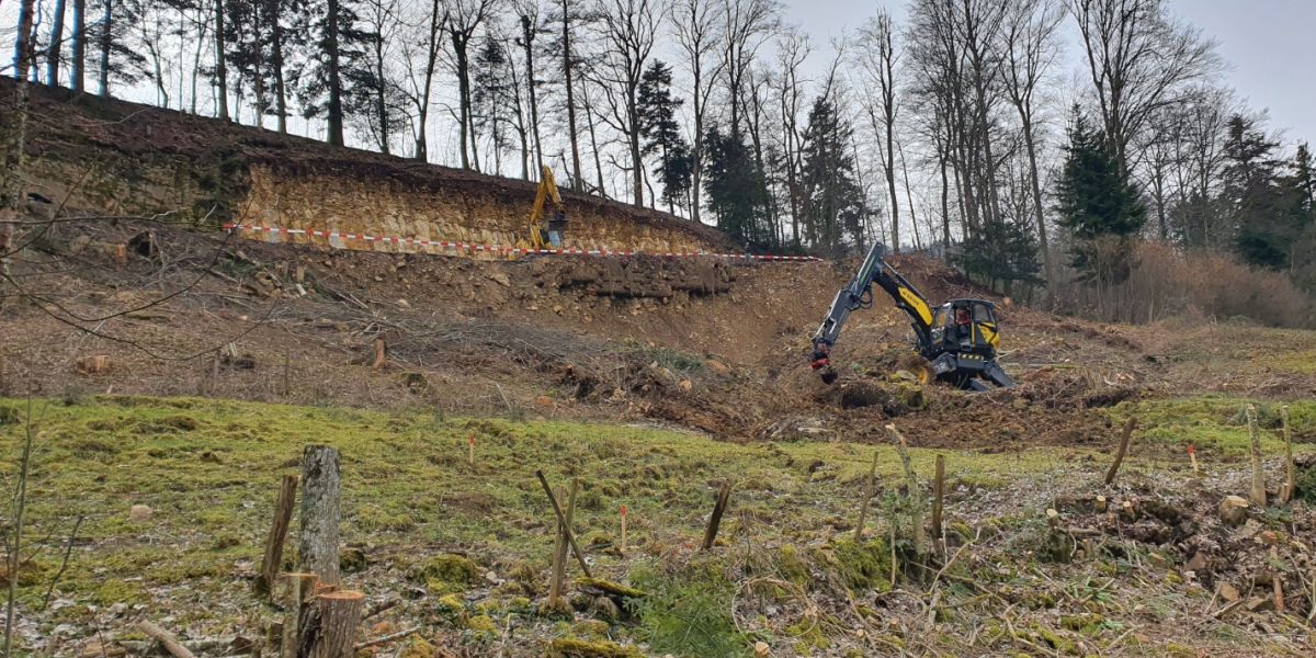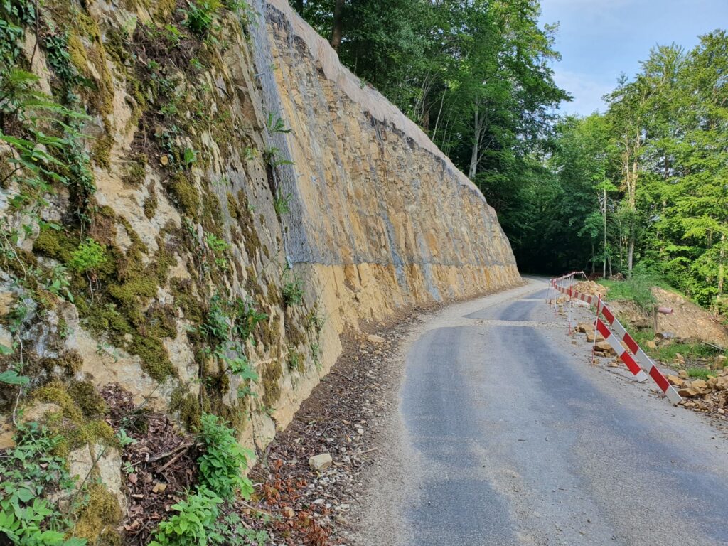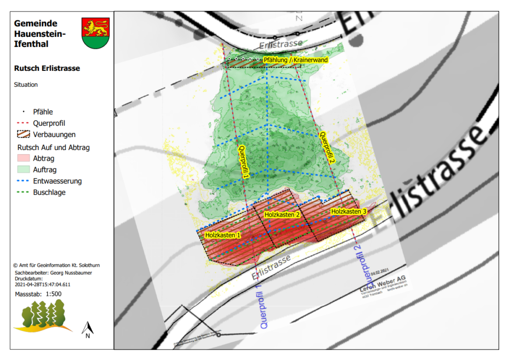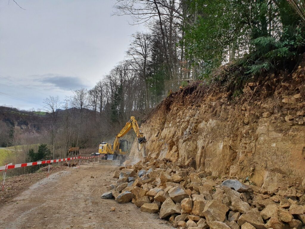 Durch die starken Niederschläge im Januar ist ein Teil der Erlistrasse, welche als Zufahrt zum Hof Oberwald und Zum Schiessplatz Erli-Horn-Spittelberg dient, abgerutscht. Unser Betrieb hat die Projektleitung bei der Sanierung übernommen. Nachdem der Rutsch gesichert und durch den Geologen Richard Waite, PNP Geologen AG beurteilt worden war, Wurde als Sofortmassnahme die Fahrbahn der Strasse in den südlichen Hang hinein verbreitert, so dass sich diese nun auf dem Fels befindet.